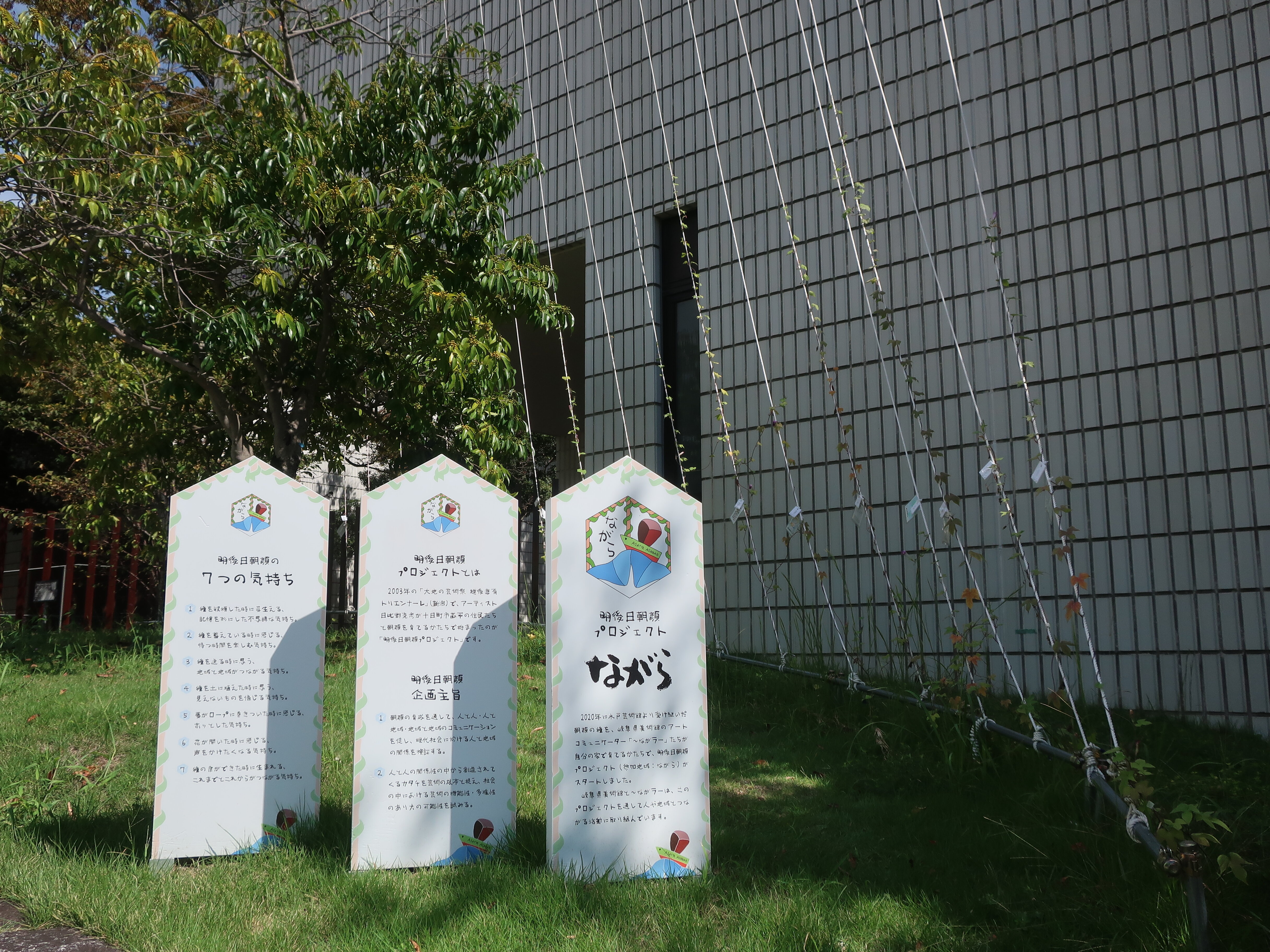 To the right of the main gate is the atelier, which serves as the venue for the Artist in Museum (AiM) program where invited artists create their works, as well as the base for activities of the museum supporters, or volunteers. A part of the Day After Tomorrow Morning Glory Project by Director Hibino Katsuhiko and the museum’s art communicators, the “Nagarers,” also caught our attention. This is an art project initiated by Hibino as an artist, in collaboration with residents of the Azamihira village in Tokamachi City, Niigata Prefecture. It began as a morning glory cultivation initiative during the Echigo-Tsumari Art Triennale held in Niigata in 2003. More than twenty communities throughout Japan are taking part in the project.
