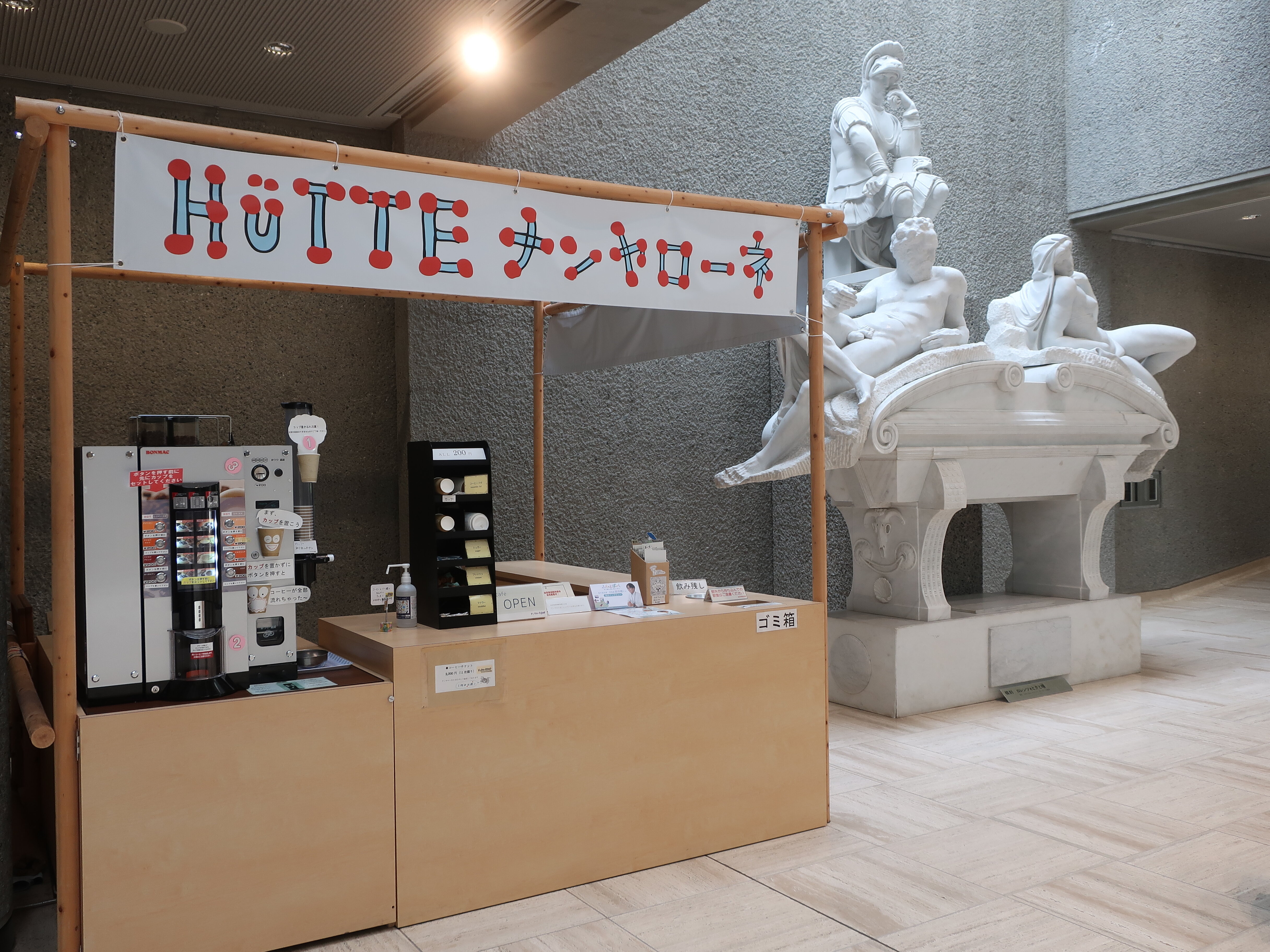 The cafe corner HüTTE NANYARONE. Hutte means mountain hut in German. It was added to the multipurpose hall after the renovation. Visible to the side is a replica of Michelangelo's Lorenzo, Evening, and Dawn.