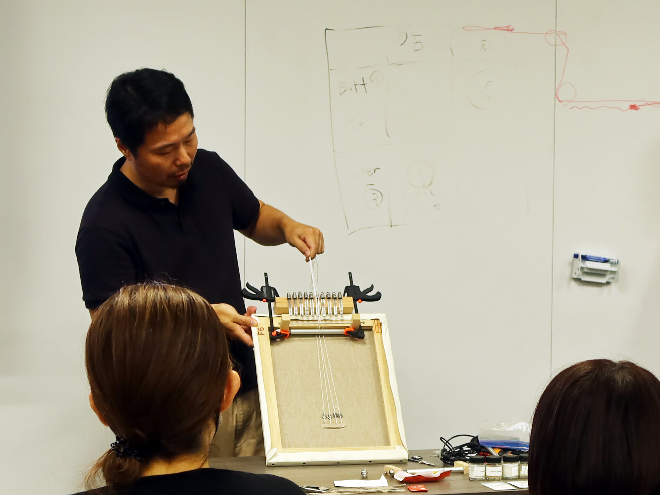 土師さんには、実践動画を交えた分かりやすいスライド解説に加え、シドニーでのワークショップの体験をもとに、現地で支給された修復キットやご自身で自作、工夫された道具類を実際に披露していただきました。また、Single Thread Bondingと同じく現地シドニーで学ばれた、キャンバスの変形修正「トレッカー装置」の仕様も、実演を交えて詳しくご紹介いただきました。