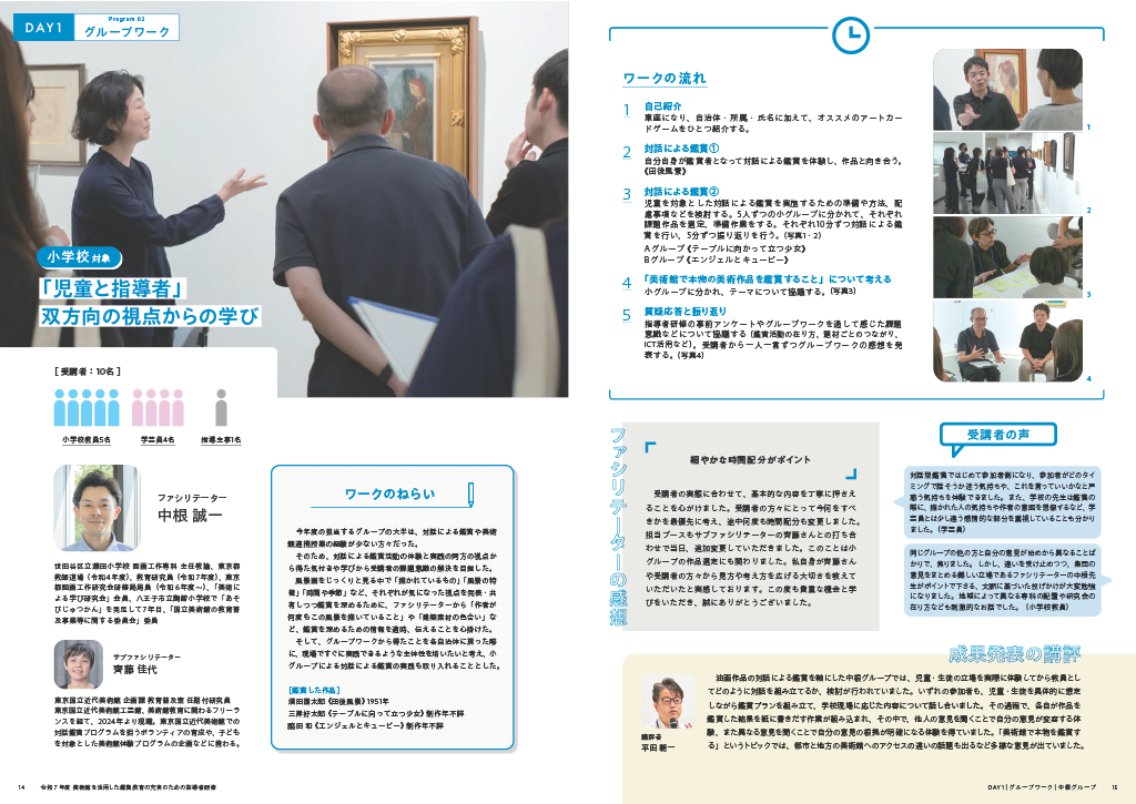 「美術館を活用した鑑賞教育の充実のための指導者研修」の概要については以下のURLをご覧ください。https://ncar.artmuseums.go.jp/activity/learning/training/