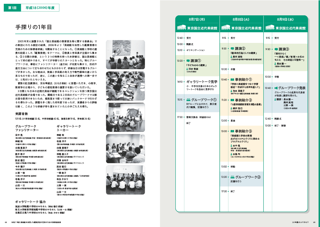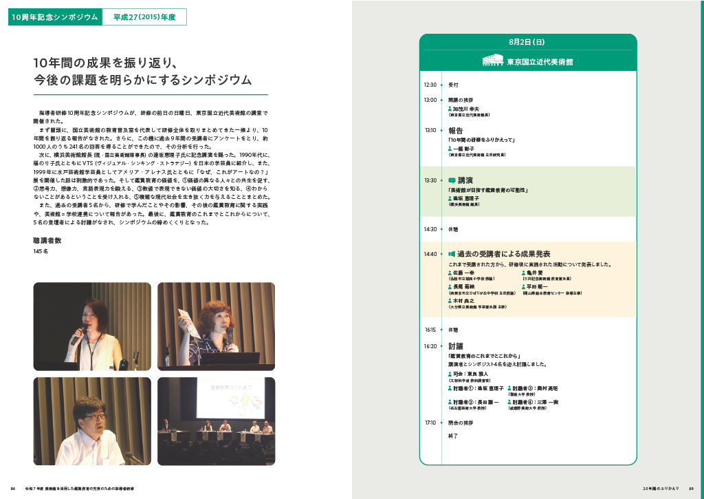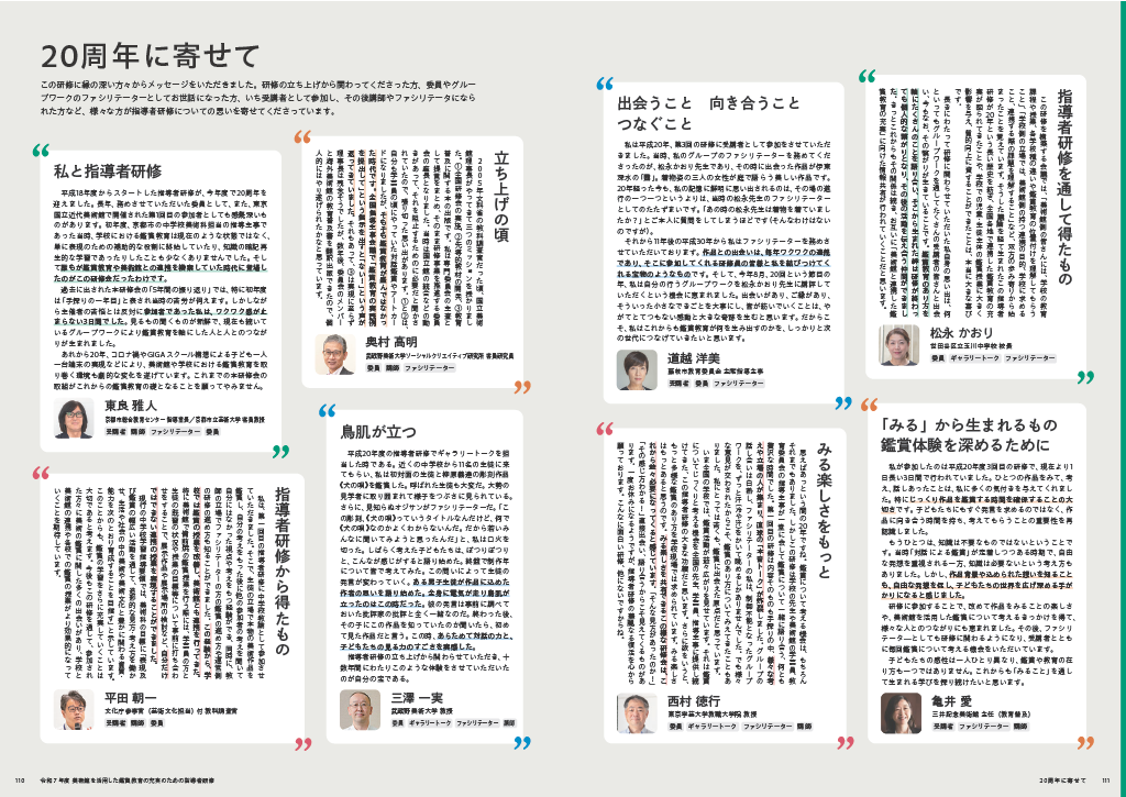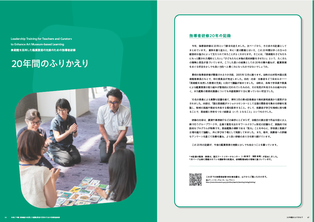 本研修は今年で20周年を迎えました。報告書の巻末には20年間の記録を掲載し、研修の形態や内容が時代とともに変化してきた様子を振り返ることができます。また、当時の関係者から寄せられた寄稿文も収録し、研修の歩みをご紹介しています。
