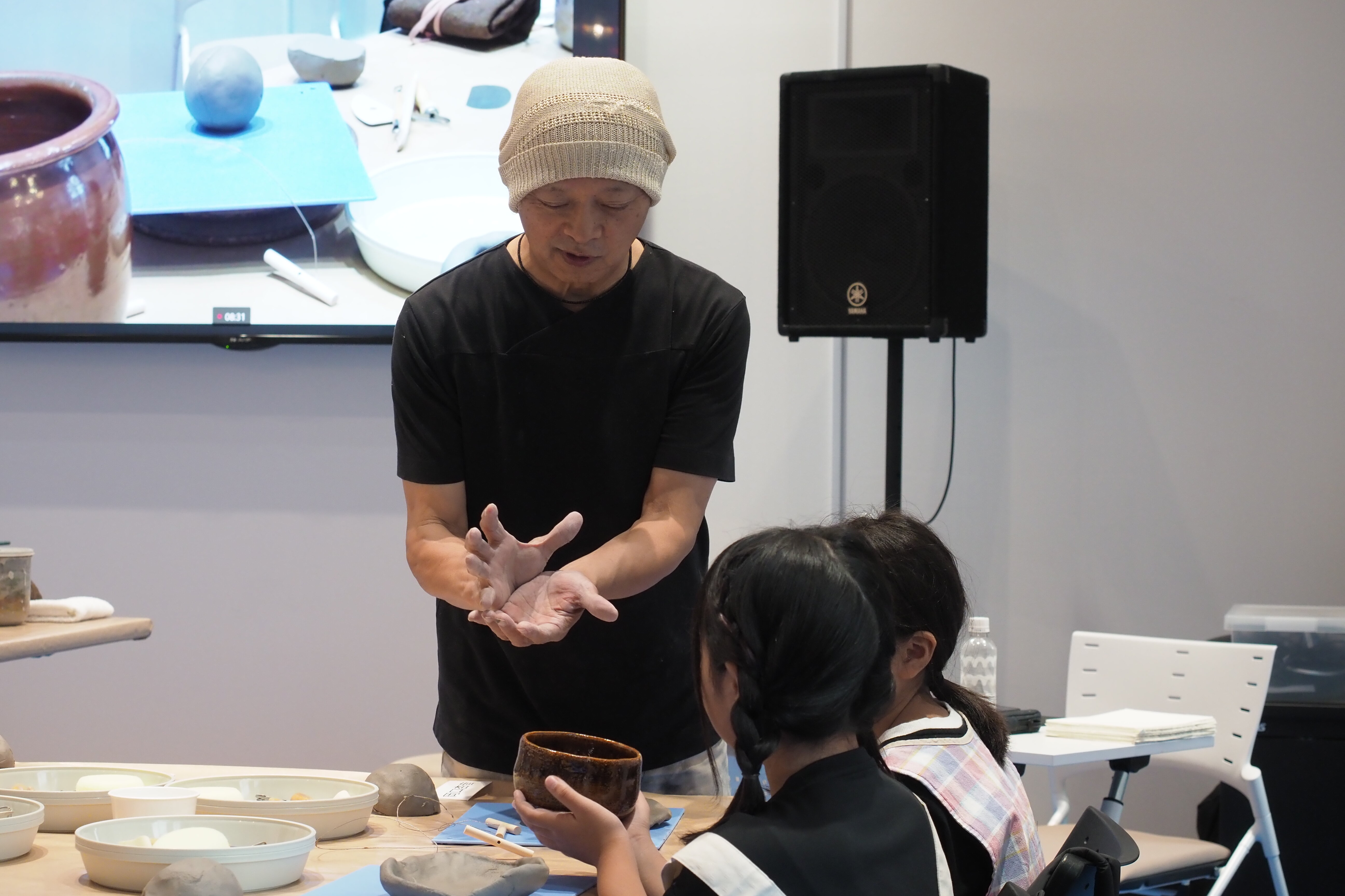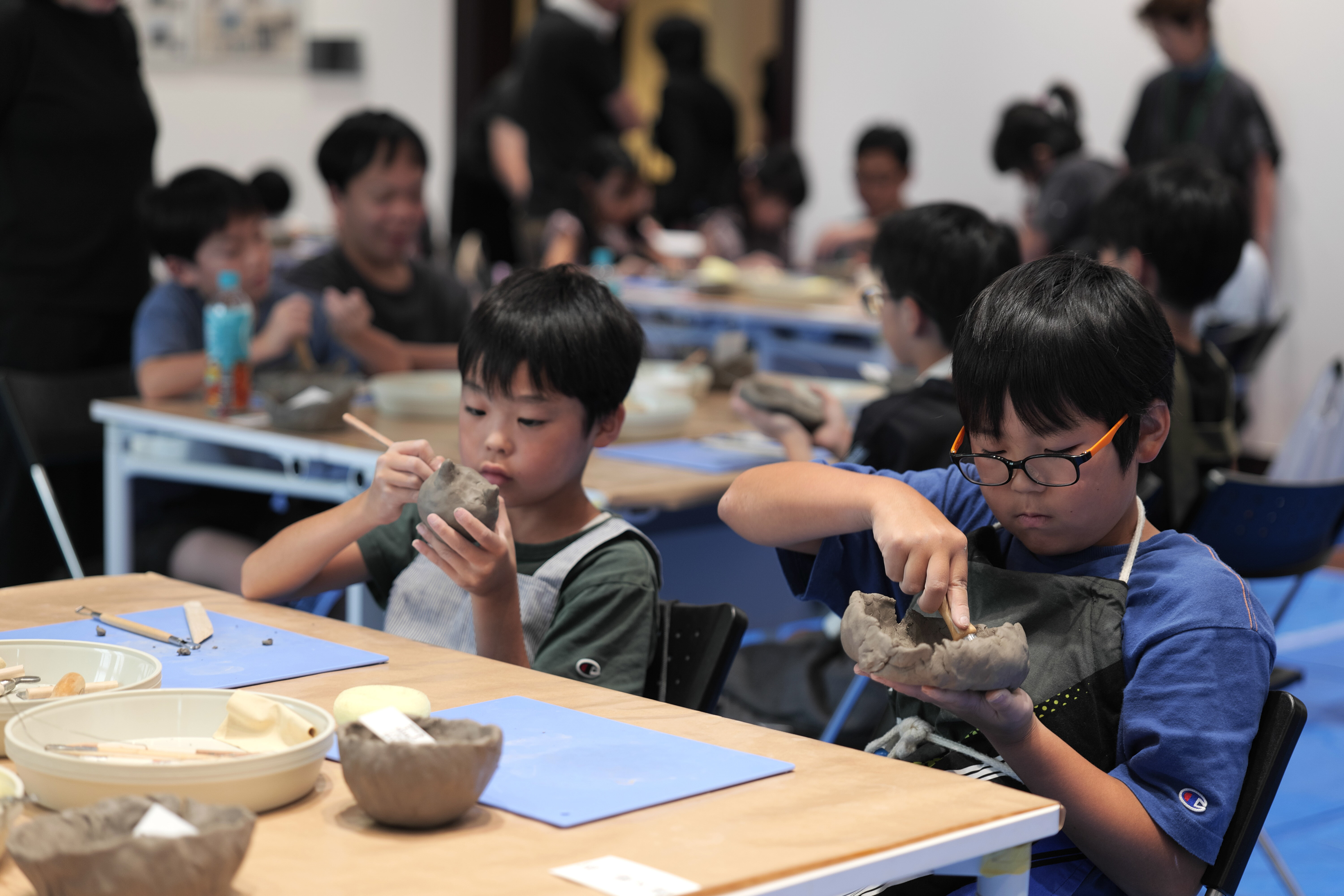2025年8月10日(土)、32名の小学生が国立工芸館に集まり、ワークショップが開催されました。参加者は講師のレクチャーを聞きながら、やきもの素材である土や「大樋焼」について学ぶとともに、大切な人を思って何かをつくることや、作った器を大切に扱うことについて考えながら、それぞれの想いがこもった作品を作り上げました。